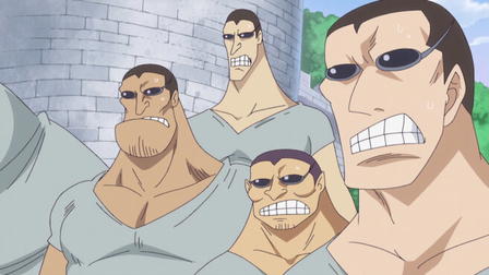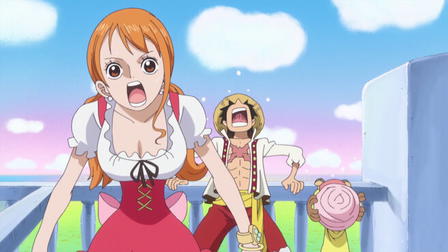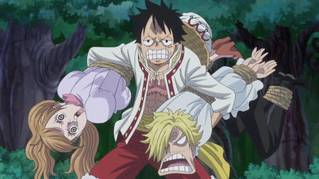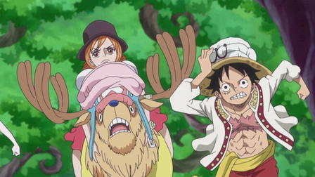 Shanks and his pirate crew are incredibly strong and they beat down the mountain bandits. Higuma, the head of the mountain bandits, runs away kidnapping Luffy and heads for the sea. However, they encounter a local Sea Monster there and are attacked. Luffy is in a desperate situation... But again, Shanks saves the day. He outstares the Sea Monster and chases it away but in exchange, he loses his left arm...